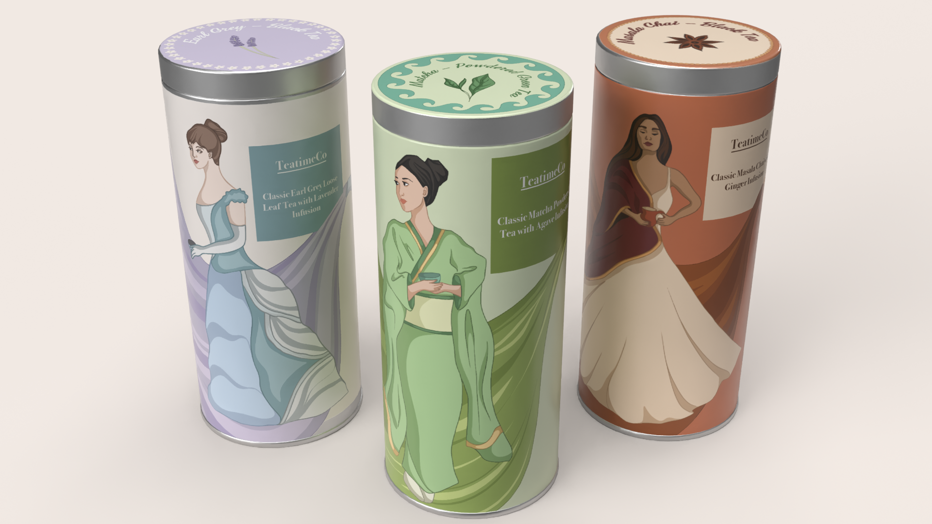 Self Photographed and Digital Mockups of Tea Tin Illustrative Packaging.