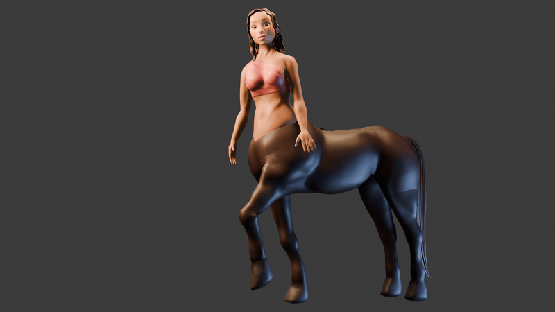Posed 3D model of Centaur sculpted, textured, rigged, and posed in Blender.